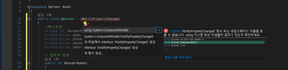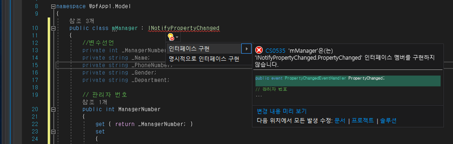 - 빨간 물결밑줄이 쳐진 INotifyPropertyChanged 위에 마우스 커서를 올려놓으면 뜨는 창에서 잠재적 수정 사항 표시를 클릭한다