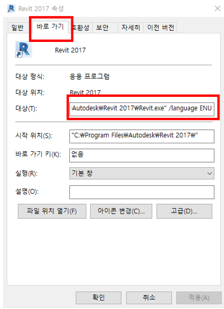 - 영어 : Autodesk\Revit 2017\Revit.exe" /language ENU